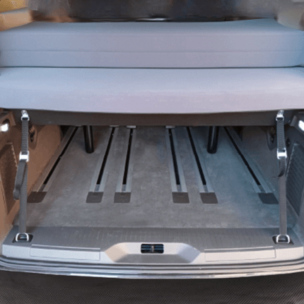 Bei einem VW T7 Multivan mit 5 Rücksitzen bietet die Schlafauflage auch ohne zusätzliche Stützfüße stabilen Halt.