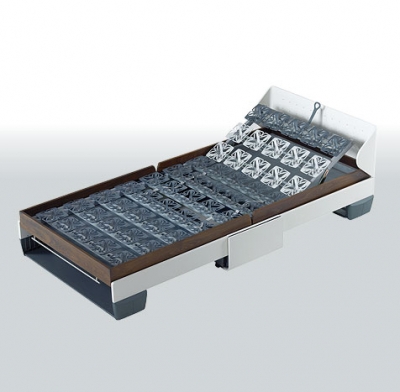 Punktuell unterfedert mit flexiblen Kunststoffelementen passt es sich den 4 Körperzonen und dem -gewicht individuell an und ermöglicht ein gesundes orthopädisch korrektes Liegen. Eine softe Schulterzone (gekennzeichnet durch hellgraue Federelemente) entlastet Halswirbel und den Schulter-/Nackenbereich. Der Härtegrad, vor allem im Lordosen-/unterem Rückenbereich, kann optional mit leicht einsetzbaren Spannkreuzen um 50% erhöht werden. Und da jeder Mensch andere Schlafgewohnheiten hat, ist die Kopfneigung individuell einstellbar. Das Bett ist mit einer durchgängigen, 11 cm hohen Kaltschaummatratze ausgestattet, die speziell für klappbare Betten entwickelt wurde.
